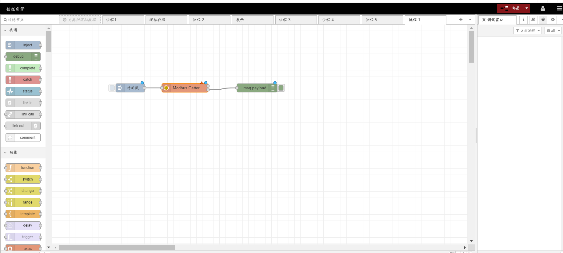 inject节点放到最前面做触发,然后拖一个Modbus-Getter节点,后面连接一个debug节点看输出,要用Modbus-Getter节点下面的接口接debug