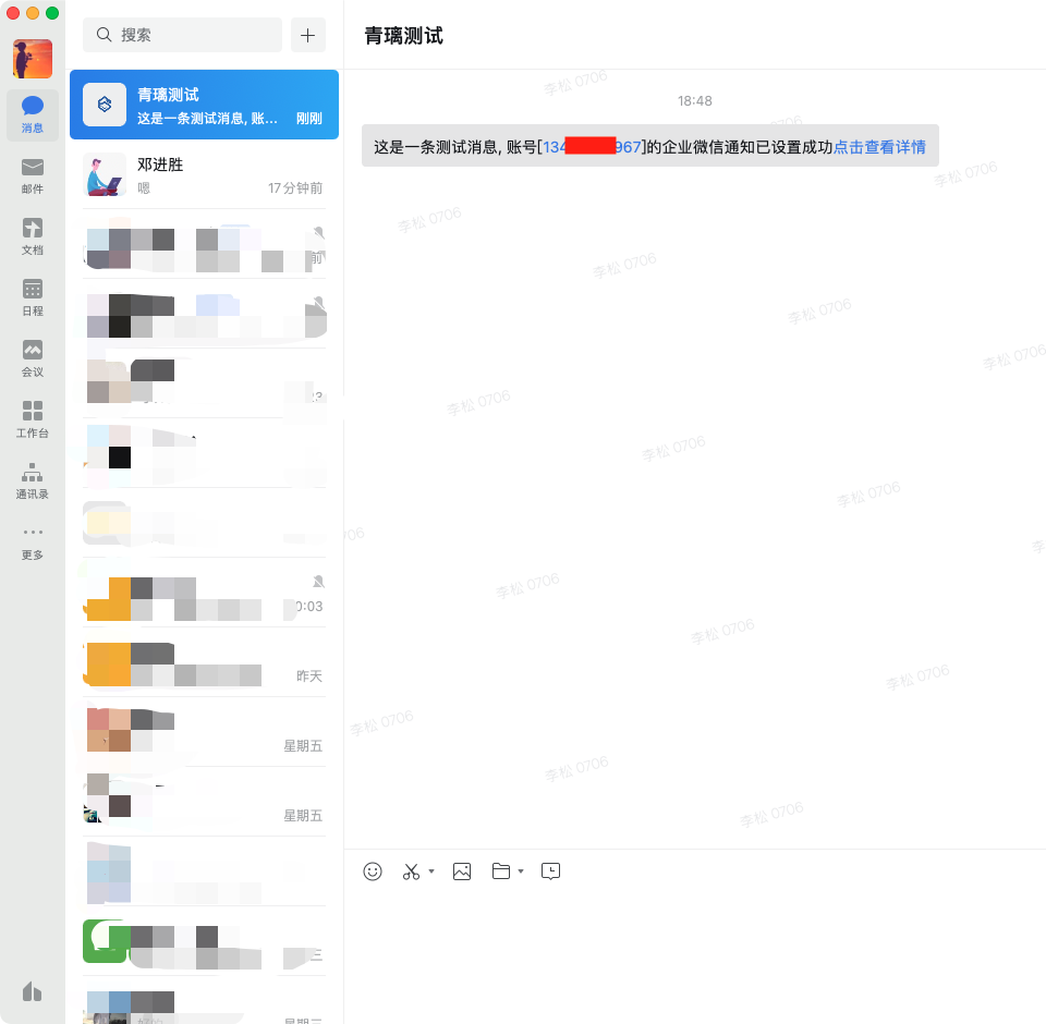 点击【发送企业微信测试消息】按钮,上述手机号绑定的企业微信账号就会收到一条测试消息,表示已配置完成